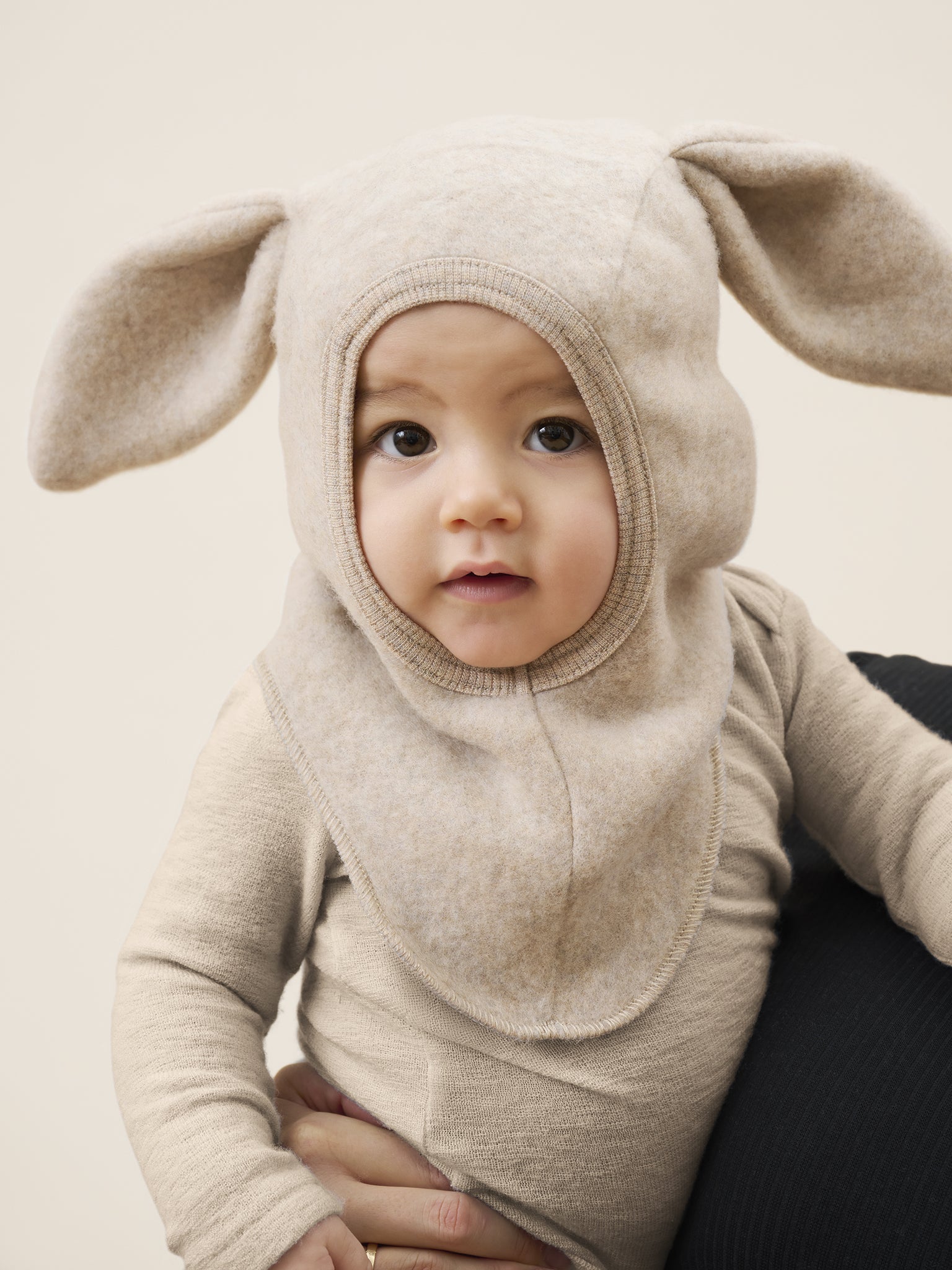 Armas HUTTELiHUTi tuukrimüts kahekihilise disainiga, valmistatud pehmest villafliisist ning kaunistatud armsate jänesekõrvadega. Balaklaval on ümar peakuju ning kitsas soonikkoes serv näo ümber, mis tagab hea ja mugava istuvuse. Kaelaosas on praktiline pikendatud lõige, mis kaitseb selga ja kaela külma eest.